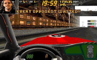 Using Otis P. Jivefunk in the Caddy Fat Cat in the Carmageddon demo using the newcar patch and the time crack that disables the 5-minute demo limit (but not the game's timer):